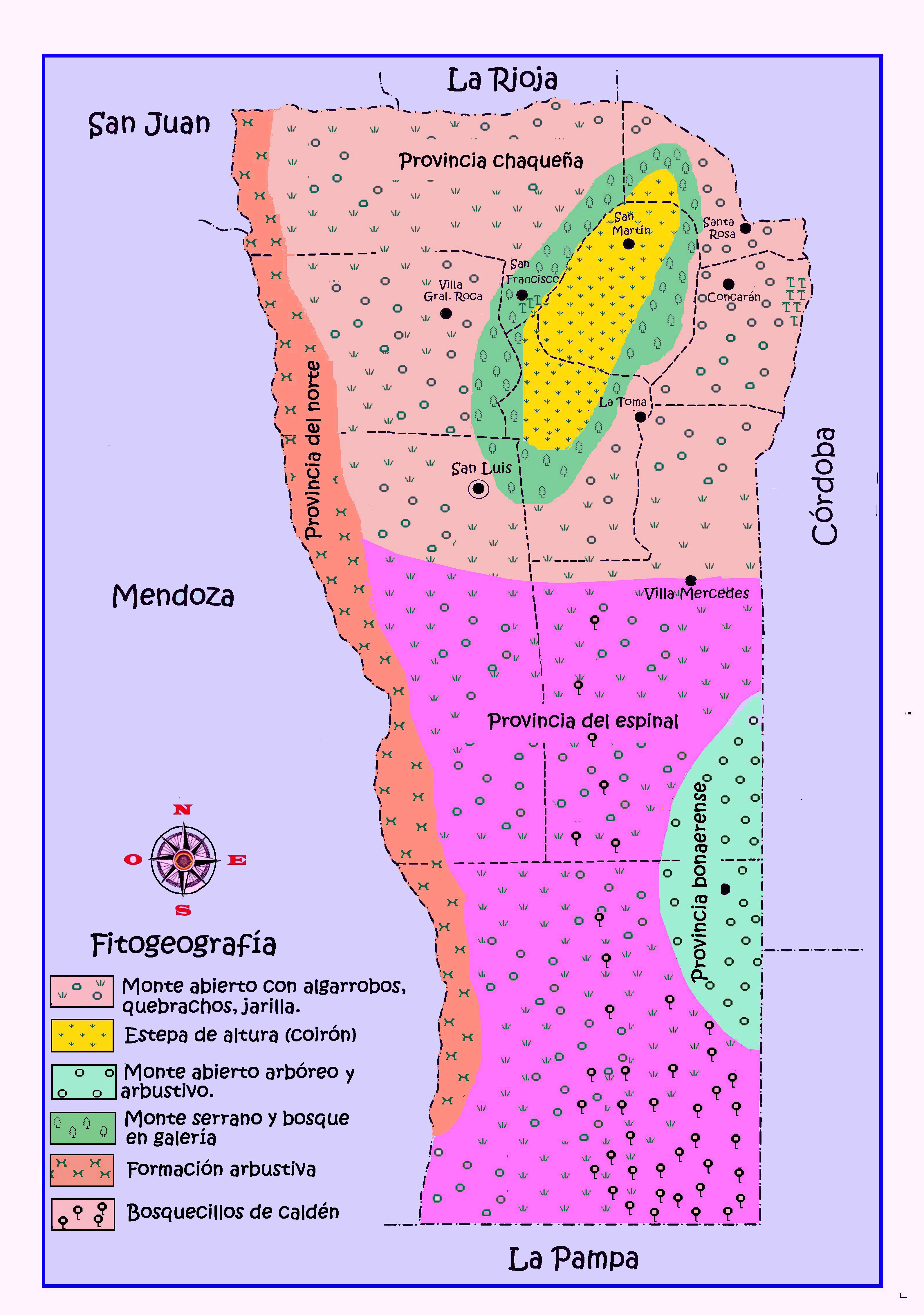 Cuando el clima es húmedo, el suelo es apropiado para la vegetación abundante y la formación de bosques. Pero cuando disminuye la humedad, la vegetación se vuelve más baja y dispersa y se distingue por la presencia de arbustos y hierbas. En San Luis, predomina una flora adaptada a la escasez de precipitaciones, aunque es más densa en aquellas áreas más húmedas.